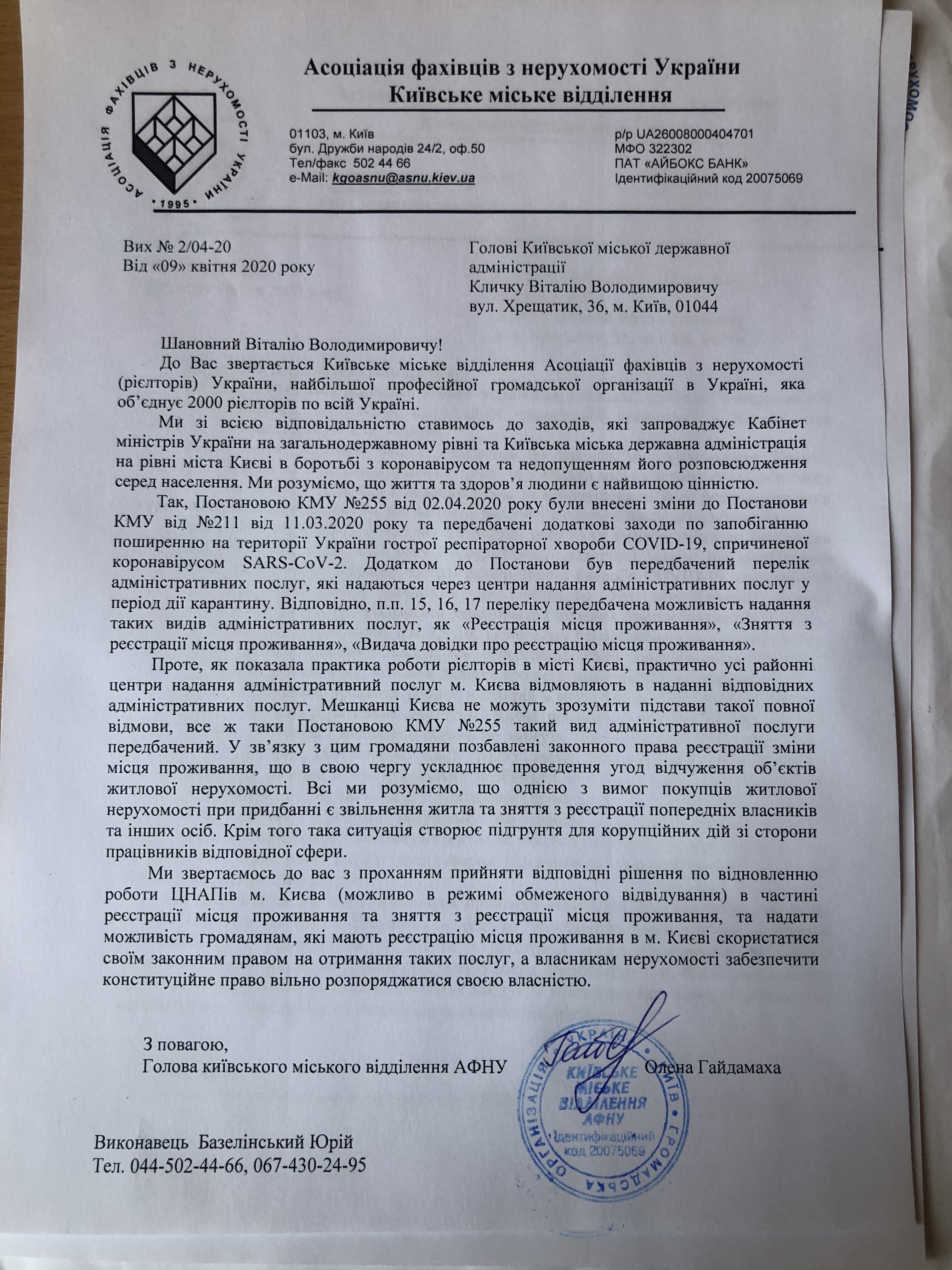 9 квітня від КМВ АФНУ було подано звернення до КМДА на ім’я Клічко В.В. з питання поновлення роботи ЦНАПів м.Києва в частині реєстрації та зняття з реєстрації місця проживання.