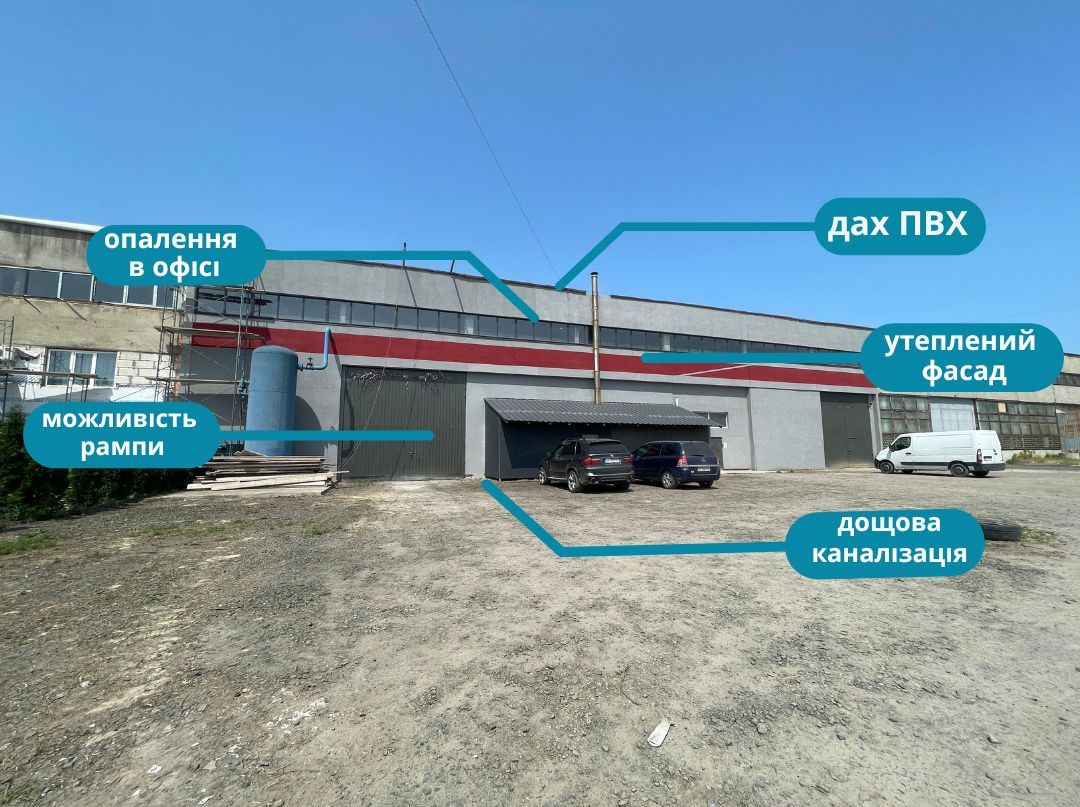 ХАРАКТЕРИСТИКИ: - площа: 2077м.в - офіс бл. 180 м.кв. - земельна ділянка 18 м від приміщеня - висота стелі: 6-10 м - висота воріт: 5 м. - крок колон: 18х12 - цілодобовий доступ до приміщення - свій санвузол - парковка на більше 12 місць - може розвернутись TIR - рівна підлога - можливість рампи - утеплений фасад - дах ПВХ