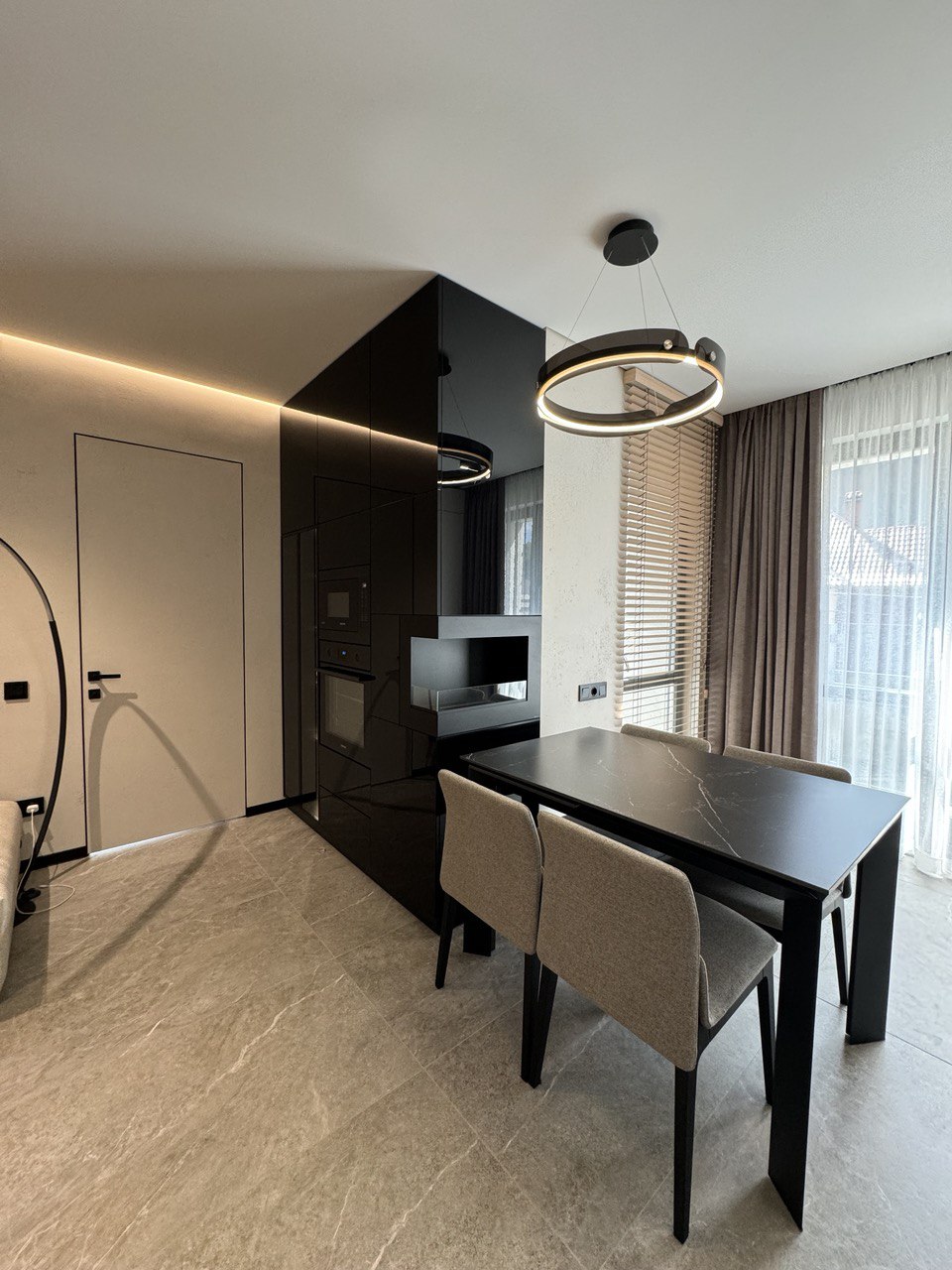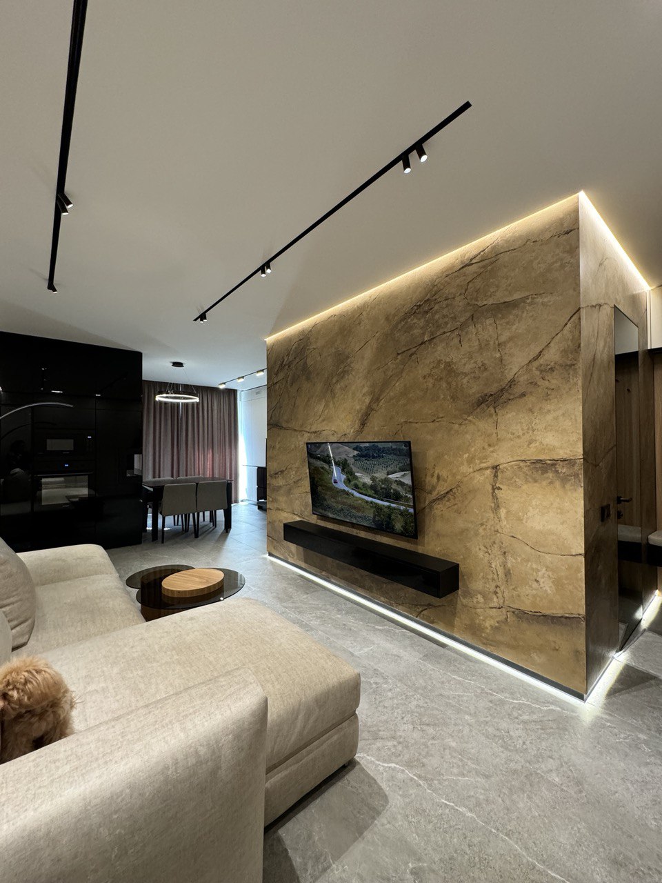 ОСНАЩЕННЯ КВАРТИРИ . всі корпусні та м’які меблі Frankoff . багато різних сценаріїв освітлення . декоративна штукатурка у всіх приміщеннях . ексклюзивна акцентна стіна під камінь, виконана вручну художниками та штукатурами . біокамін . вбудована побутова техніка . кондиціонер