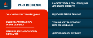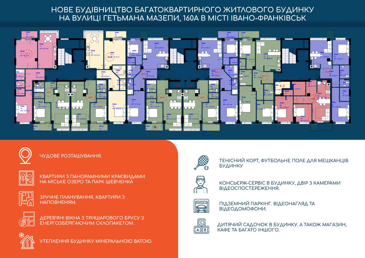 1.дерев'яні вікна з трьохшарового бруса (iv-78) сучасний енергозберігаючий склопакет. 2.Утеплення будинку мінватою. 3. Якісні вхідні двері. 4. Підземний паркінг в будинку. 5. Дитячий садок в будинку площею 200м2 6. Тенісний корт, футбольне поле, зони відпочинку, дитячий майданчик - для комфортного проведення дозвілля. 7.Консьєрж-сервіс в під'їзді будинку. 8.Внутрішній двір з камерами відеоспостереження, відеодомофони; 9.Ландшафтний дизайн прилеглої території