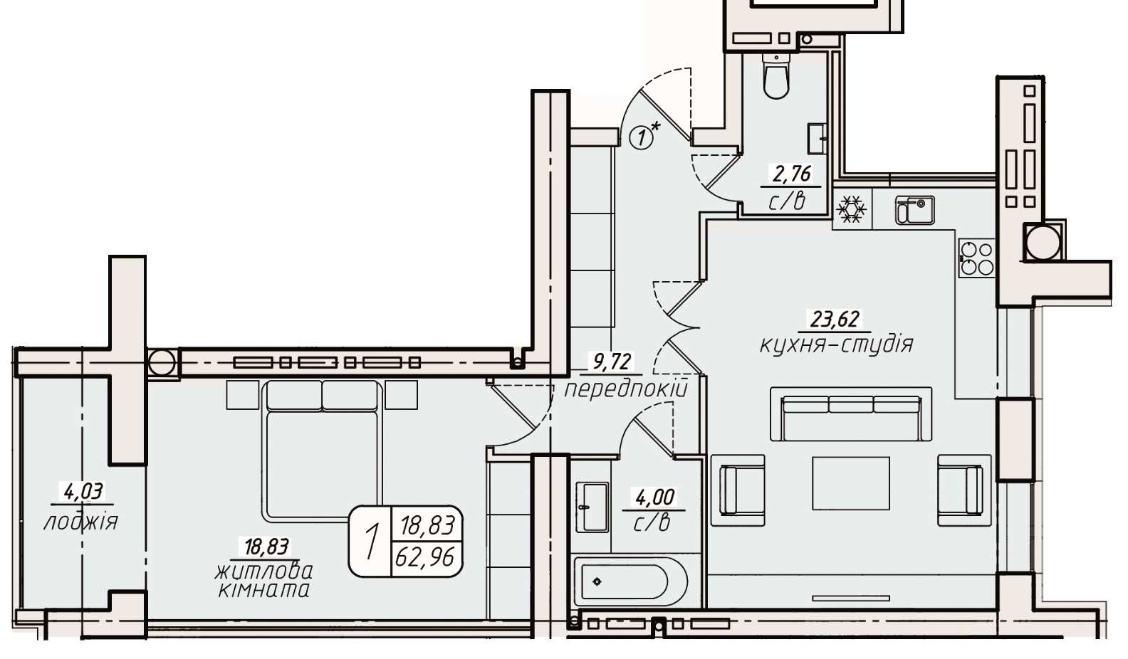 Жила площа: 23 кв.м