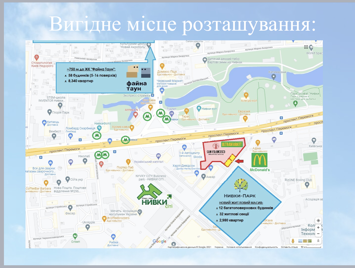 Вільне просторе приміщення з чудовим потенціалом розташоване в затишному житловому комплексі "San Francisco Creative House", вхід зі сторони "Нивки-Парк". Ця можливість ідеально підходить для реалізації ваших бізнес-проектів або створення комфортного робочого простору.