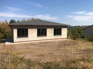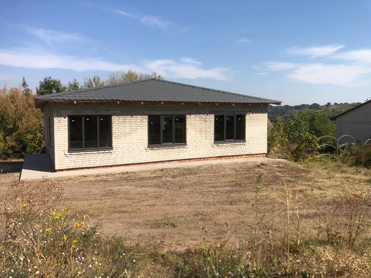 Будинок: - Цегляний, одноповерховий. - Загальна площа 118 м2. - Розмір 11.2 м x 10.5 м. - Раціональне планування. - Без оздоблення. - Дах - металочерепиця. - Вікна металопластикові. - Зроблено вимощення.